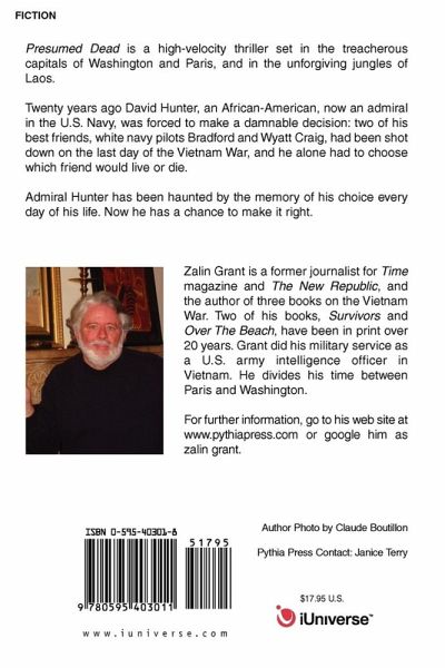 Presumed Dead is a high-velocity thriller set in the treacherous capitals of Washington and Paris, and in the unforgiving jungles of Laos. Twenty years ago David Hunter, an African-American, now an admiral in the U.S. Navy, was forced to make a damnable decision: two of his best friends, white navy pilots Bradford and Wyatt Craig, had been shot down on the last day of the Vietnam War, and he alone had to choose which friend would live or die. Admiral Hunter has been haunted by the memory of his choice every day of his life. Now he has a chance to make it right.
