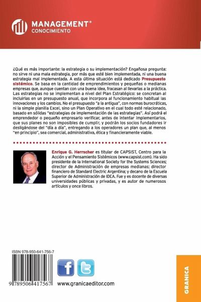 ¿Qué es más importante: la estrategia o su implementación? Inútil pregunta: no sirve ni una mala estrategia, por bien que esté implementada, ni la tan común buena estrategia mal implementada. Es a ese segundo caso que está dedicado El Presupuesto Sistémico. Se basa en la cantidad de emprendimientos y pequeñas o medianas empresas que, tras una buena idea, fracasan al implementarla. De inicio, nos sorprende con una aseveración: ¡las estrategias no se implementan al nivel del Plan Estratégico! Recién se concretan al incluirlos en un presupuesto anual, que incorpore al funcionamiento habitual las innovaciones y los cambios. O sea: no el presupuesto "a la antigua", con normas burocráticas y metas rígidas, ni la simple planilla Excel llena de números, sino un Plan Operativo en el cual todo esté relacionado, basado en sólidas "estrategias de implementación de las estrategias". Solamente así podrá el emprendedor o pequeño empresario verificar (antes de acometerlos) que sus planes no son imposibles de cumplir. De igual modo, podrán los socios fundadores ir desligándose del "día a día", entregándole a los operadores un plan que, al menos "en principio", sea comercial, administrativa, ética y financieramente viable. Enrique G. Herrscher es titular de CAPSIST, Centro para la Acción y Pensamiento Sistémicos (www.capsist.com). Ha sido presidente de la International Society for the Systems Sciences; director de Administración de empresas medianas; director financiero de Standard Electric Argentina; y decano de la Escuela Superior de Administración de IDEA. Fue y es docente de diversas universidades públicas y privadas, y es autor de numerosos artículos y once libros.