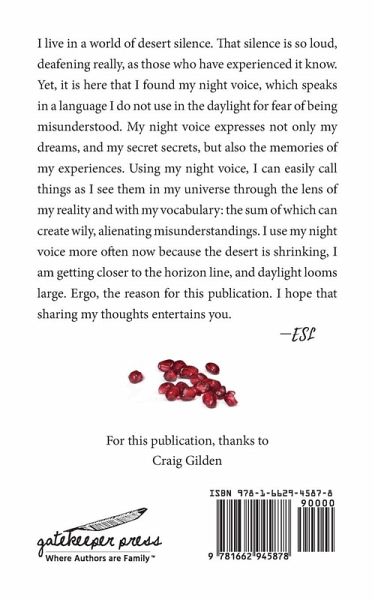 The book Pretend I'm a Pomegranate is a collection of fantastical essays, and erudite witticisms to entertain and enchant the eclectic thinker. The essays, quotations, and ephemera in Pretend I'm a Pomegranate relate tales of curious experiences, absurd situations, wonderful dreams, and the wise words of ancients. Pretend I'm a Pomegranate is a perfect book for fans of the effervescent Henri Munro (Saki) or those who remember the sages of spirituality like the pedantic Mothe Fenelon or those who have had an out-of-body experience. In other words, a perfect book for the general reader. If you have not raised an eyebrow of curiosity, or giggled shamelessly or had a word of wisdom whispered into the ears of your heart lately, seek out a pomegranate, peel it apart, taste and see what the extraordinary sweetness and radical red juice of it can do for you. Pretend I'm a Pomegranate