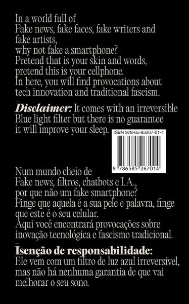 In a world full of Fake news, fake faces, fake writers and fake artists, why not fake a smartphone? Pretend that is your skin and words, pretend this is your cellphone. In here, you will find provocations about tech innovation and traditional fascism. Disclaimer: It comes with an irreversible Blue light filter but there is no guarantee it will improve your sleep. Pretend This Is A Cellphone is the latest bilingual non-fiction pocket book from Plataforma9, and was presented for the first time at A Feira do Livro in São Paulo, in June 2023. It includes an article originally published in English in AK Press's exuberant anti-fascist anthology called No Pasarán!: Antifascist Dispatches from a World in Crisis. Followed by an article originally published online at Le Monde Diplomatique, about the author's experience infiltrating Bolsonarista virtual groups; an article originally published in English in the academic journal CyberOrient, on digital monitoring of immigrants in the US and integration policies in the European Union; and finally, a short essay on the rise of Fintechs as they consider themselves to be at the forefront of financial inclusion and the fight against poverty. Index * Gringos and Fascism Part I: The Anti-[blank] Manual Part II: Capitalism, Fascism And White Supremacy Part III: The White Aesthetic Part IV: Conclusion * Virtual Vandalism and the Dispute Against Leftists * Digital Monitoring as a Threat to Human Mobility * The Ultra Wealthy Dream of Fintech Unicorns Índice * Gringos e Fascismo 7 Parte I: O Manual Anti-[insira opressão aqui] Parte II: Capitalismo, Fascismo e Supremacia Branca Parte III: A Estética Branca Parte IV: Conclusão * O vandalismo virtual e a disputa contra 'esquerdistas' * Monitoramento digital como ameaça à mobilidade humana * Os ultra ricos sonham com unicórnios da Fintech