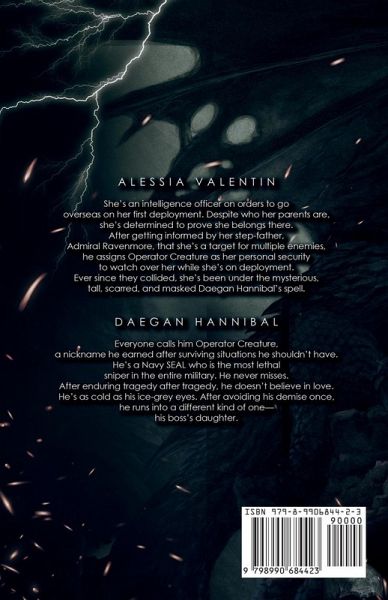 Alessia Valentín She's an intelligence officer on orders to go overseas on her first deployment. Despite who her parents are, she's determined to prove she belongs there. After getting informed by her step-father, Admiral Ravenmore, that she's a target for multiple enemies, he assigns Operator Creature as her personal security to watch over her while she's on deployment. Ever since they collided, she's been under the mysterious, tall, scarred, and masked Daegan Hannibal's spell. Daegan Hannibal Everyone calls him Operator Creature, a nickname he earned after surviving situations he shouldn't have. He's a Navy SEAL who is the most lethal sniper in the entire military. He never misses. After enduring tragedy after tragedy, he doesn't believe in love. He's as cold as his ice-grey eyes. After avoiding his demise once, he runs into a different kind of one-his boss's daughter.