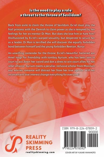 Is the need to play a role a threat to the throne of Sevildom? Back from exile to claim the throne of Sevildom, Ev'rel must play the frail princess with the Demish to claim power as she is tempted by her feelings for her ex-mentor Di Mon. But does she love him or hate him? Disillusioned by Ev'rel's warped sexuality, but desperate to secure her as a leader, Di Mon is terrified she will discover the equally forbidden bond between himself and the young forbidden Reetion, Ranar. An unwilling contender for the throne, Ev'rel's beautiful, battered son Amel longs for friendship with tom-boy Ayrium, who has been sent to court to put down her sword and don a dress to win court allies for her rebel alliance. Ayrium meets a peculiar, reclusive scholar from Monitum and worries romance will distract her from her true agenda. Will her inconvenient love interest change everything for everyone?