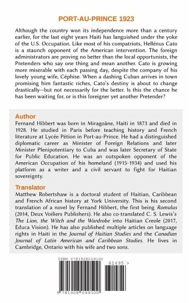 It is 1923. The location is Port-au-Prince, the scenic and sweltering capital of the Caribbean nation of Haiti. Although the country won its independence more than a century earlier, for the last eight years it has languished under the yoke of the U.S. Occupation. Like most of his compatriots, Hellénus Cato is a staunch opponent of the American intervention. The foreign administrators are proving no better than the local opportunists, the Pretenders who say one thing and mean another. Cato is growing more miserable with each passing day, despite the company of his lovely young wife, Céphise. When a dashing Cuban arrives in town promising him fantastic riches, Cato's destiny is about to change drastically-but not necessarily for the better. Is this the chance he has been waiting for, or is this foreigner yet another Pretender?