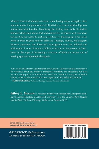 Modern historical biblical criticism, while having many strengths, often operates under the pretensions of objectivity, as if such scholarship were neutral and disinterested. Examining the history and roots of modern biblical scholarship shows that such objectivity is elusive, and was never intended by the method's earliest practitioners. Building upon his earlier work in Three Skeptics and the Bible and Theology, Politics, and Exegesis, Morrow continues this historical investigation into the political and philosophical roots of modern biblical criticism in Pretensions of Objectivity, in the hope of developing a criticism of biblical criticism and of making space for theological exegesis.