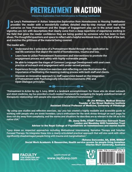 Jay Levy's Pretreatment In Action: Interactive Exploration from Homelessness to Housing Stabilization provides the reader with a wonderfully crafted, detailed step-by-step manual with real-world scenarios on how Pretreatment and the Stages of Engagement play out in the actual work. The vignettes are rich with descriptions that clearly come from a deep repertoire of experience working in the field that gives the reader confidence they are being guided by someone who has been in their shoes. The thoughtful questions and space to reflect add a helpful workbook touch to the feel of the text, and matches the grittiness of the material being covered. The reader will... Understand the 5 principles of a Pretreatment Model through their application to real-life scenarios that depict the world of homelessness, trauma and loss. Learn how to utilize Pretreatment Assessment and interventions to promote the engagement process and safety with highly vulnerable people. Effectively integrate the stages of Common Language Development with one's own practice of outreach and engagement with under-served persons. Experience through interactive exercises and reflecting on case illustrations the importance of facilitating the meaning making process with both staff and clients. Discover an innovative approach to staff supervision based on the integration of Pretreatment principles with Psychologically Informed Environments (PIE) and Open Dialogue approaches to helping "Pretreatment In Action by Jay S. Levy, MSW is a landmark accomplishment. For those who do street outreach and street medicine, Jay has provided a much-needed framework for navigating the largely undefined terrain of therapeutic relationships with those experiencing unsheltered homelessness." --Dr. Jim Withers- Medical Director and Founder of the Street Medicine Institute, Assistant Clinical Professor of Medicine, University of Pittsburgh "By using case studies and reflective exercises, Jay Levy has created a highly readable and accessible guide to working with people who are street homeless. Levy's enthusiasm for the work shines through on each page; he does not shy away from complexity, and the stories and situations he describes are as relevant in the UK as in his native USA.", --Dr. Jenny Drife- START Homeless Outreach Team, South London and Maudsley NHS Foundation Trust, Advisor to the Royal College of Psychiatrists on homelessness and mental health "Levy draws on respected approaches including Motivational Interviewing, Narrative Therapy and Solution Focused Therapy. He integrates these into a clearly articulated practical approach that will also work with other significantly disadvantaged people living with trauma and marginalization." --Rohena Duncombe, BA, BSW, MSWAP, Social work academic & researcher, Charles Sturt University, Australia Learn more at www.JaySLevy.com From Loving Healing Press www.LHPress.com
