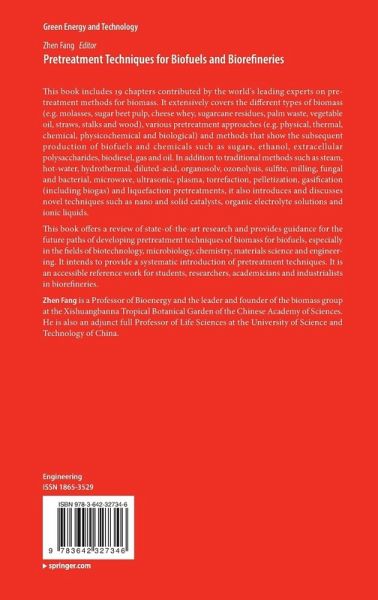 This book offers a review of state-of-the-art research and provides guidance for the future paths of developing pretreatment techniques of biomass for biofuels, especially in the fields of biotechnology, microbiology, chemistry, materials science and engineering. It intends to provide a systematic introduction of pretreatment techniques. It is an accessible reference work for students, researchers, academicians and industrialists in biorefineries.