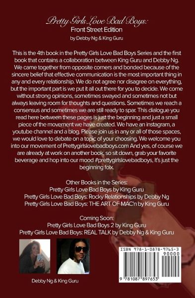 Pretty Girls Love Bad Boys: FRONT STREET EDITION This is the 4th book in the Pretty Girls Love Bad Boys Series and the first book that contains a collaboration between King Guru and Debby Ng. We came together from opposite corners and bonded because of the sincere belief that effective communication is the most important thing in any and every relationship. We do not agree nor disagree on everything, but the important part is we put it all out there for you to decide. We come without strong opinions, sometimes swayed and sometimes not but always leaving room for thoughts and questions. Sometimes we reach a consensus and sometimes we are still ready to spar. This dialogue you read here between these pages is just the beginning and just a small piece of the movement we have created. We have an instagram, a youtube channel and a blog. Please join us in any or all of those spaces, we would love to debate on a topic of your choosing. We welcome you into our movement of Prettygirlslovebadboys.com And yes, of course we are already at work on another book, so sit down, grab your favorite beverage and hop into our mood #prettygirlslovebadboys, it's just the beginning folx. King Guru's Thoughts: This PRETTY GIRLS LOVE BAD BOYS movement doesn't just start and end at the prison gates, either. I met Debby Ng when she tapped into my jpay.com email account. She had written a book called Rocky Relationships where the premise is based on convicts running Game on women. Somehow she had got her hands on my PRETTY GIRLS... book and she felt some type of way. See, my book is about teaching men how to spit fire to sexy women. She won't admit it, but I know she wasn't feeling it by the way she stepped to me. Debby's Thoughts: PRETTY GIRLS LOVE BAD BOYS is a movement and a mood created by King Guru, which I knew when I saw it! I felt the energy from this man's voice as I read the book. Even though I thought holy moly - this guy is teaching these men how to manipulate these beautiful women who I try to protect - he's a genius! There are definitely some great men on writeaprisoner I am sure and maybe there's some who are genuinely lonely and have a lot of love to give but there are also a whole group of men who.. If you give a mouse a cookie!! So Pretty Girls and Bad Boys that is why we are here! We are here to take this all to Front Street and clear up any and all misconceptions and help everyone get their self-confidence where it needs to be in order to have healthy relationships. We are going to shake this up and get down and dirty with you on any and every subject! Nothings off the table and we will stay 100 always!