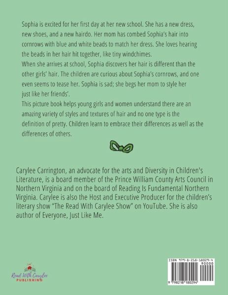 Sophia is excited for her first day at her new school. She has a new dress, new shoes, and a new hairdo. Her mom has combed Sophia's hair into cornrows with blue and white beads to match her dress. She loves hearing the beads in her hair hit together, like tiny wind chimes. When she arrives at school, Sophia discovers her hair is different than the other girls' hair. The children are curious about Sophia's cornrows, and one even seems to tease her. Sophia is sad; she begs her mom to style her just like her friends'. This picture book helps young girls and women understand there are an amazing variety of styles and textures of hair and no one type is the definition of pretty. Children learn to embrace their differences as well as the differences of others.