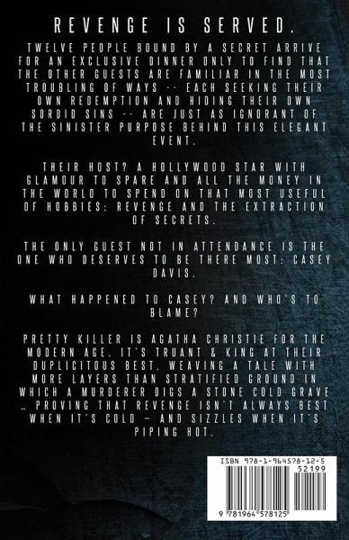 Twelve people bound by a secret arrive for an exclusive dinner only to find that the other guests are familiar in the most troubling of ways. Ella Boyer isn't looking forward to attending the Bayshore alumni dinner with her husband, Noah. There aren't enough pills in the world to numb her fears of seeing her classmates again ... especially after what she did all those years ago. Her sorority sister Heidi Blanchard, equally guilty, will be at the same exclusive restaurant that night. In the aftermath of their secret shame, Heidi's turned lying into a sport and has lost her compass for truth. She's there for a job ... or so she thinks. Bindi Bridges, former guidance counselor at Bayshore, has no idea about the alumni dinner or Heidi's job offer. She's at Crave to learn who her husband's been sleeping with, tipped by an unknown source. Mason Pace is there to meet a headhunter. His life is about to turn around - a relief, after the horror that happened eleven years ago. Seven others -- each seeking their own redemption and hiding their own sordid sins -- are just as ignorant of the sinister purpose behind this elegant event. Their host? A Hollywood star with glamour to spare and all the money in the world to spend on that most useful of hobbies: revenge and the extraction of secrets. The only guest not in attendance is the one who deserves to be there most: Casey Davis. What happened to Casey? And who's to blame? Pretty Killer is Agatha Christie for the modern age. It's Truant & King at their duplicitous best, weaving a tale with more layers than stratified ground in which a murderer digs a stone cold grave ... proving that revenge isn't always best when it's cold - and sizzles when it's piping hot.