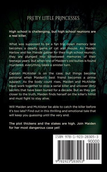 High school is challenging, but high school reunions are a real killer. When Maiden Harlow and her friends gather to reminisce about their teenage years, they are suddenly thrust into a deadly game of cat and mouse. Memories turn into nightmares when one of Maiden's old bullies is brutally murdered. And it quickly becomes clear that the killer isn't done yet. Captain McAlister is on the case, but things take a personal turn when Maiden's best friend becomes a prime suspect. Maiden and McAlister must work together to stop a serial killer and uncover dirty secrets that have been buried for years. As the body count rises, Maiden and McAlister race against time to catch the killer before it's too late. But as they get closer to the truth, Maiden finds herself on the killer's hitlist and must fight to stay alive. Can they solve the case and put an end to the deadly reunion, or will Maiden become the next victim? If you love chilling cozy mysteries full of secrets, danger and romance, this is the book for you! Join Maiden for her most dangerous case yet!
