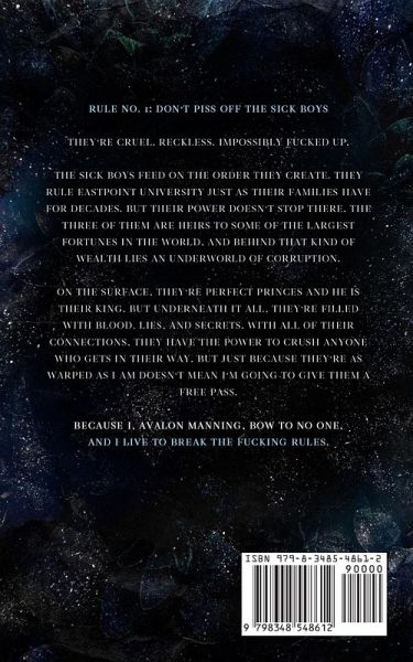 Rule No. 1: Don't piss off the Sick Boys They're cruel. Reckless. Impossibly messed up. The Sick Boys feed on the order they create. They rule Eastpoint University just as their families have for decades. But their power doesn't stop there. The three of them are heirs to some of the largest fortunes in the world, and behind that kind of wealth lies an underworld of corruption. On the surface, they're perfect princes and he is their King. But underneath it all, they're filled with blood, lies, and secrets. With all of their connections, they have the power to crush anyone who gets in their way. But just because they're as warped as I am doesn't mean I'm going to give them a free pass. Because I, Avalon Manning, bow to no one, and I live to break the fucking rules. ***This is a Dark MF Enemies to Lovers College Romance.*** ***Please Note: This book is labeled as "Dark" for a reason. If you are sensitive or easily triggered by subjects and actions that are common in "dark" romance, please take that into consideration and read responsibly.***