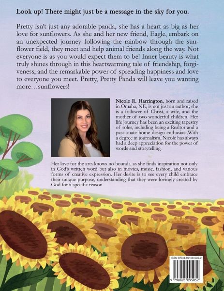 Embark on a heartwarming journey through the clouds with Pretty, Pretty Panda, a lovable tale that will touch your heart and brighten your day. Meet Pretty, a remarkable panda with a heart as big as her love for sunflowers. When she and her new friend Eagle decide to trace the colors of the radiant rainbow through a sunflower field, they encounter a diverse cast of animal friends, each with their own unique story. Their colorful journey reminds us all that inner beauty is all about the kindness and love we share with each other. This enchanting story is a celebration of friendship, forgiveness, and the extraordinary power of spreading happiness and love to all you meet. Experience the warmth of this enchanting narrative that will leave you with a heart full of joy and a longing for more...sunflowers.
