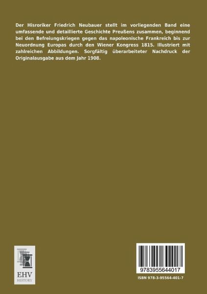 Der Hisroriker Friedrich Neubauer stellt im vorliegenden Band eine umfassende und detaillierte Geschichte Preußens zusammen, beginnend bei den Befreiungskriegen gegen das napoleonische Frankreich bis zur Neuordnung Europas durch den Wiener Kongress 1815. Illustriert mit zahlreichen Abbildungen. Sorgfältig überarbeiteter Nachdruck der Originalausgabe aus dem Jahr 1908.