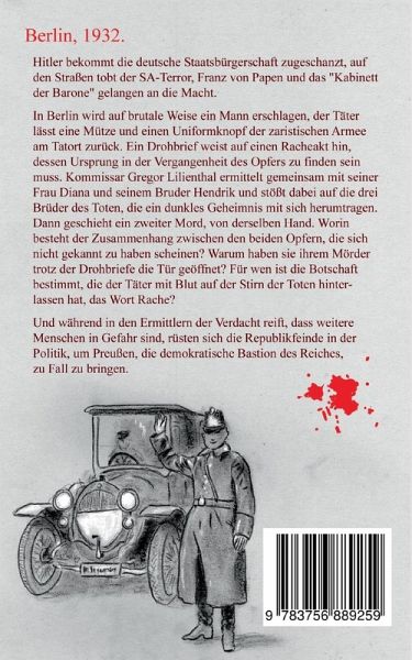 Berlin, 1932. Hitler bekommt die deutsche Staatsbürgerschaft zugeschanzt, auf den Straßen tobt der SA-Terror, Franz von Papen und das "Kabinett der Barone" gelangen an die Macht.In Berlin wird auf brutale Weise ein Mann erschlagen, der Täter lässt eine Mütze und einen Uniformknopf der zaristischen Armee am Tatort zurück. Ein Drohbrief weist auf einen Racheakt hin, dessen Ursprung in der Vergangenheit des Opfers zu finden sein muss. Kommissar Gregor Lilienthal ermittelt gemeinsam mit seiner Frau Diana und seinem Bruder Hendrik und stößt dabei auf die drei Brüder des Toten, die ein dunkles Geheimnis mit sich herumtragen. Dann geschieht ein zweiter Mord, von derselben Hand. Worin besteht der Zusammenhang zwischen den beiden Opfern, die sich nicht gekannt zu haben scheinen? Warum haben sie ihrem Mörder trotz der Drohbriefe die Tür geöffnet? Für wen ist die Botschaft bestimmt, die der Täter mit Blut auf der Stirn der Toten hinterlassen hat, das Wort Rache?Und während in den Ermittlernder Verdacht reift, dass weitere Menschen in Gefahr sind, rüsten sich die Republikfeinde in der Politik, um Preußen, die demokratische Bastion des Reiches, zu Fall zu bringen.