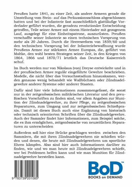 Preußen hatte 1841, zu einer Zeit, als andere Armeen gerade die Umstellung vom Stein- auf das Perkussionsschloss abgeschlossen hatten und bei der Infanterie fast ausschließlich glattläufige Vorderlader geführt wurden, die geradezu revolutionäre Entscheidung getroffen, Teile seiner Armee mit einem Hinterlader mit gezogenem Lauf, ausgelegt für eine Einheitspatrone, auszurüsten. Preußen verschaffte seiner Infanterie so einen technischen Vorsprung von mehr als 20 Jahren. Durch die Heeresreform von 1859/60 und den technischen Vorsprung bei der Infanteriebewaffnung wurde Preußens Armee zur stärksten Armee Europas, die, geführt von Moltke, den wohl besten Strategen seiner Zeit, in den Kriegen von 1864, 1866 und 1870/71 letztlich das Deutsche Kaiserreich schuf. Im Buch werden nur von Nikolaus (von) Dreyse entwickelte und in der preußischen Armee regulär eingeführte Gewehre beschrieben. Modelle, die nicht über das Versuchsstadium hinauskamen, werden genauso wenig behandelt wie Wallbüchsenoder Zündnadelgewehre anderer Systeme oder anderer Staaten.Dafür sind hier viele Informationen zusammengefasst, die sonst nur in der zeitgenössischen militärischen Literatur und den preußischen Vorschriften zu finden sind, vor allem Angaben zur Munition der Zündnadelgewehre, zu ihrer Pflege, zu zeitgenössischen Reparaturen, zum Umgang und zur zeitgenössischen Schießpraxis. Damit ist dieses Buch auch eine Ergänzung von historisch oder technisch orientierten Schriften über die Zündnadelgewehre. Auch der Sammler findet hier Informationen, zum Beispiel solche, die es ihm ermöglichen, zeitgenössische von neuzeitlichen Reparaturen zu unterscheiden.Außerdem soll hier eine Brücke geschlagen werden zwischen den Sammlern, die mit ihren Zündnadelgewehren nie schießen würden und denen, die heute mit Zündnadelgewehren um sportliche Ehren kämpfen. Also sind hier auch Informationen darüber zu finden, wie und wo man heute mit Zündnadelgewehren schießt, wer bei Problemen helfen kann und wie man Munition für Zündnadelgewehre herstellen kann.