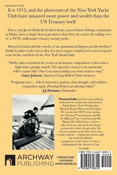 It is 1913, and the plutocrats of the New York Yacht Club have amassed more power and wealth than the US Treasury itself. Davey and Jacob Haskell, brothers from a poor lobster fishing community in Maine, have a single shot at greatness when they try out for the sailing crew of a NYYC millionaire's luxury racing yacht. Honor, betrayal, and the cruelty of an egomaniacal skipper put the brothers' family loyalties to the test as they set out to expose a dark secret covered up for years in the corridors of the New York Yacht Club. "Dolby takes us behind the scenes as an intense competition evolves into a high stakes grudge match. The quest for victory is an emotional roller coaster ride. Once you start reading you won't want to stop." -Gary Jobson, America's Cup Hall of Fame Inductee "A ripping yarn ... full of mysteries, passion, class struggle, and ruthless competitive spirit. Prevailing Wind is an absolute blast!" -J.J.Abrams, Filmmaker
