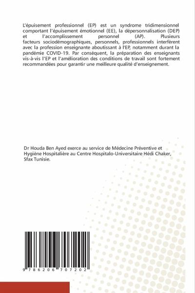 L'épuisement professionnel (EP) est un syndrome tridimensionnel comportant l'épuisement émotionnel (EE), la dépersonnalisation (DEP) et l'accomplissement personnel (AP). Plusieurs facteurs sociodémographiques, personnels, professionnels interfèrent avec la profession enseignante aboutissant à l'EP, notamment durant la pandémie COVID-19. Par conséquent, la préparation des enseignants vis-à-vis l'EP et l'amélioration des conditions de travail sont fortement recommandées pour garantir une meilleure qualité d'enseignement.