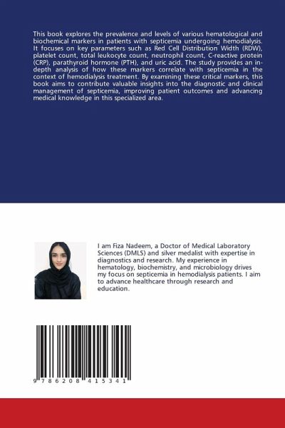 This book explores the prevalence and levels of various hematological and biochemical markers in patients with septicemia undergoing hemodialysis. It focuses on key parameters such as Red Cell Distribution Width (RDW), platelet count, total leukocyte count, neutrophil count, C-reactive protein (CRP), parathyroid hormone (PTH), and uric acid. The study provides an in-depth analysis of how these markers correlate with septicemia in the context of hemodialysis treatment. By examining these critical markers, this book aims to contribute valuable insights into the diagnostic and clinical management of septicemia, improving patient outcomes and advancing medical knowledge in this specialized area.