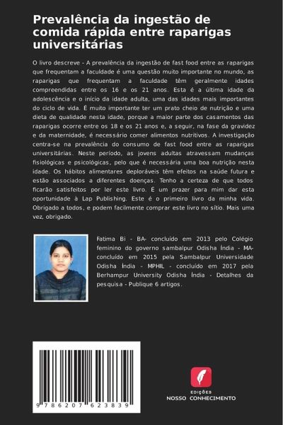 O livro descreve - A prevalência da ingestão de fast food entre as raparigas que frequentam a faculdade é uma questão muito importante no mundo, as raparigas que frequentam a faculdade têm geralmente idades compreendidas entre os 16 e os 21 anos. Esta é a última idade da adolescência e o início da idade adulta, uma das idades mais importantes do ciclo de vida. É muito importante ter um prato cheio de nutrição e uma dieta de qualidade nesta idade, porque a maior parte dos casamentos das raparigas ocorre entre os 18 e os 21 anos e, a seguir, na fase da gravidez e da maternidade, é necessário comer alimentos nutritivos. A investigação centra-se na prevalência do consumo de fast food entre as raparigas universitárias. Neste período, as jovens adultas atravessam mudanças fisiológicas e psicológicas, pelo que é necessária uma boa nutrição nesta idade. Os hábitos alimentares deploráveis têm efeitos na saúde futura e estão associados a diferentes doenças. Tenho a certeza de que todos ficarão satisfeitos por ler este livro. É um prazer para mim dar esta oportunidade à Lap Publishing. Este é o primeiro livro da minha vida. Obrigado a todos, e podem facilmente comprar este livro no sítio. Mais uma vez, obrigado.