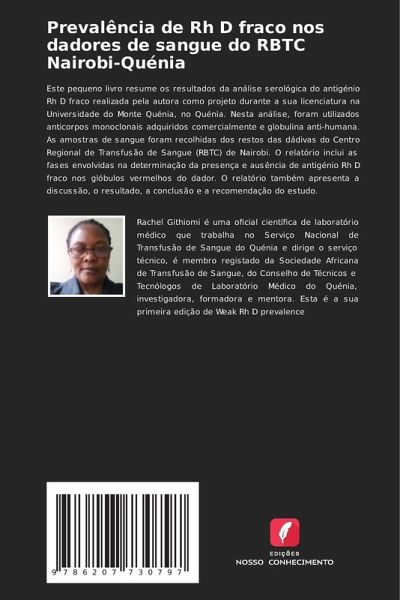 Este pequeno livro resume os resultados da análise serológica do antigénio Rh D fraco realizada pela autora como projeto durante a sua licenciatura na Universidade do Monte Quénia, no Quénia. Nesta análise, foram utilizados anticorpos monoclonais adquiridos comercialmente e globulina anti-humana. As amostras de sangue foram recolhidas dos restos das dádivas do Centro Regional de Transfusão de Sangue (RBTC) de Nairobi. O relatório inclui as fases envolvidas na determinação da presença e ausência de antigénio Rh D fraco nos glóbulos vermelhos do dador. O relatório também apresenta a discussão, o resultado, a conclusão e a recomendação do estudo.