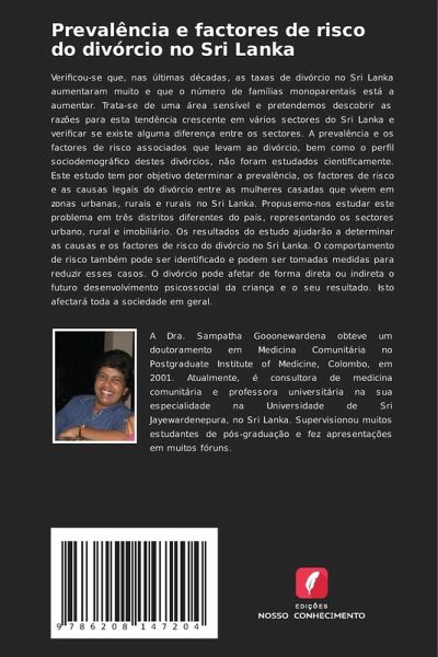 Verificou-se que, nas últimas décadas, as taxas de divórcio no Sri Lanka aumentaram muito e que o número de famílias monoparentais está a aumentar. Trata-se de uma área sensível e pretendemos descobrir as razões para esta tendência crescente em vários sectores do Sri Lanka e verificar se existe alguma diferença entre os sectores. A prevalência e os factores de risco associados que levam ao divórcio, bem como o perfil sociodemográfico destes divórcios, não foram estudados cientificamente. Este estudo tem por objetivo determinar a prevalência, os factores de risco e as causas legais do divórcio entre as mulheres casadas que vivem em zonas urbanas, rurais e rurais no Sri Lanka. Propusemo-nos estudar este problema em três distritos diferentes do país, representando os sectores urbano, rural e imobiliário. Os resultados do estudo ajudarão a determinar as causas e os factores de risco do divórcio no Sri Lanka. O comportamento de risco também pode ser identificado e podem ser tomadas medidas para reduzir esses casos. O divórcio pode afetar de forma direta ou indireta o futuro desenvolvimento psicossocial da criança e o seu resultado. Isto afectará toda a sociedade em geral.