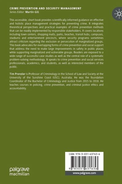 This accessible, short book provides scientifically informed guidance on effective wholistic place management strategies for preventing crime. It integrates theoretical perspectives and practical examples of crime prevention methods that can be readily implemented by responsible stakeholders. It covers locations including town centers, shopping malls, parks, beaches, transit hubs, campuses, stadiums and entertainment precincts, where security programs sometimes attract criticism regarding the exclusion or persecution of marginalized groups. This book advocates for overlapping forms of crime prevention and social support that address the need to make large improvements in safety in public places while supporting marginalized and vulnerable groups. Readers are exposed to a wide range of successful case studies as well as the central role of a systematic problem-solving methodology. It speaks to crime prevention and social services professionals, academics, and students, as wellas interested members of the public.