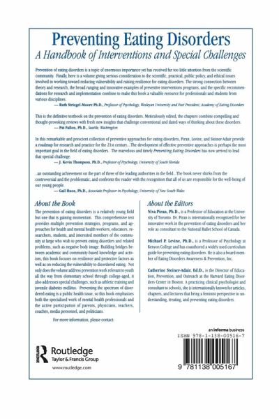 This comprehensive resource provides multiple prevention strategies, programs, and approaches for health and mental health workers, educators, researchers, students, and interested members of the community at large who work to prevent eating disorders and related problems.
