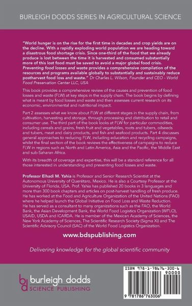 This book provides a comprehensive review of the causes and prevention of food losses and waste (FLW) at key steps in the supply chain. The book begins by defining what is meant by food losses and waste and then assessing current research on its economic, environmental and nutritional impact. Part 2 assesses what we know about FLW at different stages in the supply chain, from cultivation, harvesting and storage, through processing and distribution to retail and consumer use. The third part of the book looks at FLW for particular commodities, including cereals and grains, fresh fruit and vegetables, roots and tubers, oilseeds and tubers, meat and dairy products, and fish and seafood products. Part 4 discusses general approaches to reducing FLW, including education and recycling campaigns, whilst the final section in the book reviews the effectiveness of campaigns to reduce FLW in regions such as North and Latin America, Asia and the Pacific, the Middle East and, sub-Saharan Africa. With its breadth of coverage and expertise, this will be a standard reference for all those interested in understanding and preventing food losses and waste.