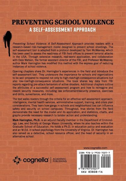 Preventing School Violence: A Self-Assessment Approach provides readers with a research-based risk-management model designed to prevent school shootings. The self-assessment tool is adapted from a protocol developed by Tom McWeeney, which has been used to assess the readiness of FBI field offices to prevent terrorist attacks in the USA. Through extensive research, real-world application, and collaboration with Dale Watson, the former assistant director of the FBI, and Professor McWeeney, author Mark Harrington has modified this method with the express goal of reducing instances of school violence. Opening chapters share Dr. Harrington's experiences in the field and introduce the self-assessment tool. They underscore the importance for schools and organizations to be well prepared to respond not only to high-risk/high-consequence situations but also low-risk/high-consequence situations. The book shares key data from FBI reports regarding pre-attack behaviors of active shooters. Additional chapters outline the attributes of a successful self-assessment program and how to reimagine and rework security measures, including law enforcement/security presence, exercises and drills, surveillance, and more. The text walks readers through the criteria for an effective self-assessment approach: intelligence, mental health services, administrative support, training, and crisis plan considerations. They learn how gangs in schools and neighborhood ties can influence safety and security on school campuses. Throughout, true stories from the field demonstrate the need for the model and its application, and statistics, charts, and graphs provide necessary research to bolster action and understanding.