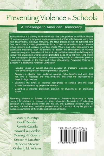 Contents: Preface. J.N. Burstyn Violence and Its Prevention: A Challenge for Schools. Part I: The Social Context of Violence in Schools.R. Casella What Is Violent About "School Violence?" The Nature of Violence in a City High School. K.M. Williams The Importance of Ethnography in Understanding Violence in Schools. G. Bender Resisting Dominance? The Study of a Marginalized Masculinity and Its Construction Within High School Walls. H.W. Gordon Someone Is Screaming: A Short Story. J.N. Burstyn Account of an Interview With the Author. K.M. Williams "Frontin' It": Schooling Violence and Relationships in the Hood. K.V. Luschen Interrupting "Good" Girliness: Sexuality Education and the Prevention of Violence Against Women. Part II: Appraising Strategies to Counter School Violence.J.N. Burstyn R. Stevens Involving the Whole School in Violence Prevention. R. Casella The Cultural Foundations of Peer Mediation: Beyond a Behaviorist Model of Urban School Conflict. R. Stevens Peer Mediation: An Examination of a School District's Training Program for Educators. K.M. Williams What Derails Peer Mediation? D.P. Guerra J.N. Burstyn Reaching Troubled Teens Through a Literacy Tutoring Project. J.N. Burstyn The Challenge for Schools: To Prevent Violence While Nurturing Democracy.