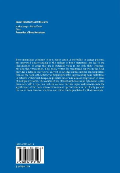 Bone metastases continue to be a major cause of morbidity in cancer patients, but improved understanding of the biology of bone metastases has led to the identification of drugs that are of potential value in not only their treatment but also their prevention. This book, written by recognized experts in the field, provides a detailed overview of current knowledge on this subject. One important focus of the book is the efficacy of bisphosphonates in preventing bone metastases in patients with breast, lung, and prostate cancer and disease progression in cases of multiple myeloma. The combined use of bisphosphonates and cytostatics is also discussed, with a report on first clinical data. Further topics addressed include the significance of the bone microenvironment, special issues in the elderly patient, the use of bone turnover markers, and initial findings obtained with denosumab.