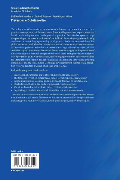 This volume provides a serious examination of substance use prevention research and practice as components of the continuum from health promotion through to prevention and health care in sub-groups and in the general population. Extensive background chapters provide portals into the evolution of the field and the cutting edge research being conducted on the etiology, epidemiology, and genetics of substance use and abuse. The global nature and health burden of substance use and abuse incorporates assessments of the serious problems related to the prevention of legal substance use (i.e., alcohol and tobacco) and how lessons learned in those arenas may apply to the prevention of illicit substance use. Research and practice chapters detail a range of effective evidence-based programs, policies and practices and emerging prevention interventions from the literatures on the family and school contexts in addition to innovations involving mindfulness and the social media. Continued advancements in substance use prevention research, practice, training, and policy are projected.