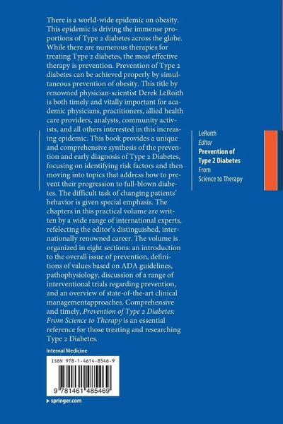 There is a world-wide epidemic on obesity. This epidemic is driving the immense proportions of Type 2 diabetes across the globe. While there are numerous therapies for treating Type 2 diabetes, the most effective therapy is prevention. Prevention of Type 2 diabetes can be achieved properly by simultaneous prevention of obesity. Prediabetes, or metabolic syndrome, is the period between simple obesity and diabetes, and this critical period needs to be identified in a more consistent and systematic manner by clinicians worldwide. Clinical trials have indicated that diabetes prevention can be achieved by lifestyle changes and also by certain medications, though none are yet approved for use in prevention. On the other hand, there are funding agencies such as the NIH, CDC, and State Institutions that are interested in studying the prevention paradigms in different communities and ethnic minorities who are most prone to this epidemic. For these reasons, this title by renowned physician-scientist Derek LeRoith is both timely and vitally important for academic physicians, practitioners, allied health care providers, analysts, community activists, and all others interested in this increasing epidemic. This book provides a unique and comprehensive synthesis of the prevention and early diagnosis of Type 2 Diabetes, focusing on identifying risk factors and then moving into topics that address how to prevent their progression to full-blown diabetes. The difficult task of changing patients' behavior is given special emphasis. The chapters in this practical volume are written by a wide range of international experts, reflecting the editor's distinguished, internationally renowned career. The volume is organized in eight sections: an introduction to the overall issue of prevention, definitions of values based on ADA guidelines, pathophysiology, discussion of a range of interventional trials regarding prevention, and an overview of state-of-the-art clinical managementapproaches. Comprehensive and timely, Prevention of Type 2 Diabetes: From Science to Therapy is an essential reference for those treating and researching Type 2 Diabetes.