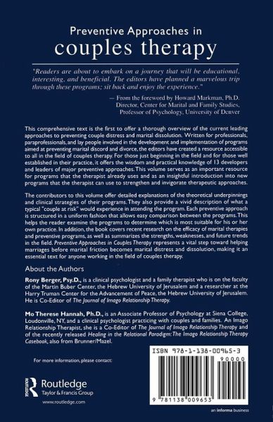 Preventive Approaches in Couples Therapy is the first thorough overview of the leading approaches to preventing marital distress and dissolution. Written for professionals, paraprofessionals, and lay people involved in the development and implementation of preventive programs, the editors have created a resource accessible to all those in the field of couples therapy. The volume serves as an important resource for programs that the therapist may already use and as an insightful introduction into new programs that can strengthen and invigorate these existing therapeutic approaches.