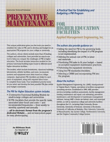 This unique publication gives you the tools you need to establish the value of PM, and to develop and budget for an appropriate PM program for your college or university. The authors, whose clients include more than 25 leading colleges and universities, have provided an easy-to-use tool to help you conquer the challenges of PM in higher education. The book includes interactive models for the primary functional building types found in different-sized higher education facilities. The models, which include dormitories, classroom buildings, laboratories, athletic facilities, and more, incorporate systems and equipment most often found on college campuses. Appropriate PM checklists are linked to each piece of equipment, along with required labor hours to complete those tasks. Four established priority levels let you select and develop the best possible PM plan within your budget constraints. The PM for Higher Education system includes: * 13 interactive Functional Building Models for small-to-large colleges and universities. * 50 PM checklists that provide the specific tasks, associated labor hours and costs -- and recommended frequencies -- from weekly to monthly, quarterly and annually. . . . all in electronic format from the program's dedicated Website . . . and on heavy-stock paper for easy photocopying. The authors also provide guidance on: * Selling the need for PM to the governing body, including identifying the impact if a PM program is not implemented. * Defining the annual cost of PM, in labor and materials. * Prioritizing PM tasks to fit your budget -- based on accepted equipment maintenance practices. * Performing the equipment inventory. * Using the PM standards/checklists. * Selecting a CMMS and incorporating PM into the program.