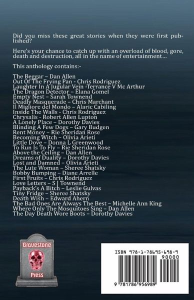 IT'S SECOND TIME AROUND FOR THESE GREAT HORROR STORIES. Did you miss these great stories when they were first published? Here's your chance to catch up with an overload of blood, gore, death and destruction, all in the name of entertainment... Great stories by great Gravestone Press writers. This anthology contains: - The Beggar - Dan Allen Out Of The Frying Pan - Chris Rodriguez Laughter In A Jugular Vein -Terrance V Mc Arthur The Dragon Detector - Elana Gomel Empty Nest - Sarah Townend Deadly Masquerade - Chris Marchant Il Migliore del Mondo - Alaric Cabiling Inside The Walls - Chris Rodriguez Chrysalis - Robert Allen Lupton A Lonely Place - Dorothy Davies Blinding A Few Dogs - Gary Budgen Rent Money - Rie Sheridan Rose Becoming Witch - Olivia Arieti Little Dove - Donna L Greenwood To Run Is To Fly - Rie Sheridan Rose Above the Ceiling - Dan Allen Dreams of Duality - Dorothy Davies Lost and Damned - Olivia Arieti The Lute Woman - Sheree Shatsky Bobby Bumping - Diane Arrelle First Fruits - Chris Rodriguez Love Letters - S J Townend Payback's A Bitch - Leslie Gulvas Tiny Fridge - Sheree Shatsky Death Wish - Edward Ahern The Bad Ones Are Always The Best - Michelle Ann King Where Only The Mosquitoes Sing - Dan Allen The Day Death Wore Boots - Dorothy Davies