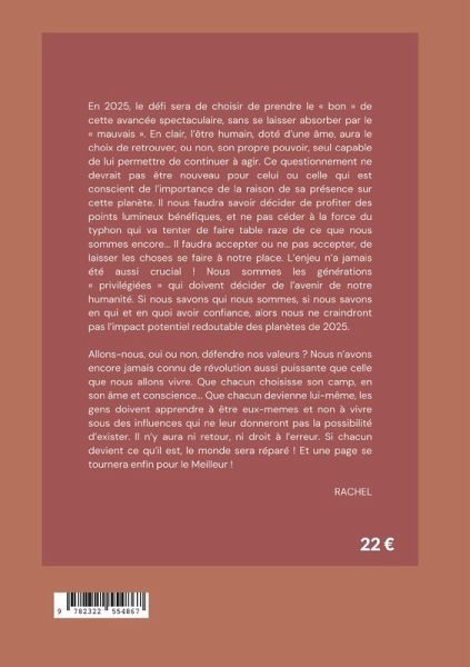 En 2025, le défis sera de choisir de prendre le "bon" de cette avancée spectaculaire, sans se laisser absorber par le "mauvais". En clair, l'être humain, doté d'une âme, aura le choix de retrouver, ou non, son propre pouvoir, seul capable de lui permettre de continuer à agir. Ce questionnement ne devrait pas être nouveau pour celui ou celle qui est conscient de l'importance de la raison de sa présence sur cette planète. Il nous faudra savoir décider de profiter des points lumineux bénéfiques, et ne pas céder à la force du typhon qui va tenter de faire table rase de ce que nous sommes encore... Il faudra accepter ou ne pas accepter de laisser les choses faire à notre place. L'enjeu n'a jamais été aussi crucial ! Nous sommes les générations privilégiées" qui doivent décider de l'avenir de notre humanité. Si nous savons qui nous sommes, si nous savons en qui et en quoi avoir confiance, alors nous ne craindront pas l'impact potentiel redoutable des planètes de 2025. Allons nous, oui ou non, défendre nos valeurs ? Nous n'avons encore jamais connu de révolution aussi puissante que celle que nous allons vivre. Que chacun choisisse son camp, en son âme et conscience... Que chacun devienne lui-même, les gens doivent apprendre à être eux-même et non à vivre sous des influences qui ne leur donneront pas la possibilité d'exister. Il n'y aura ni retour, ni droit à l'erreur. Si chacun devient ce qu'il est, le monde sera réparé ! Et une page se tournera enfin pour le Meilleur !