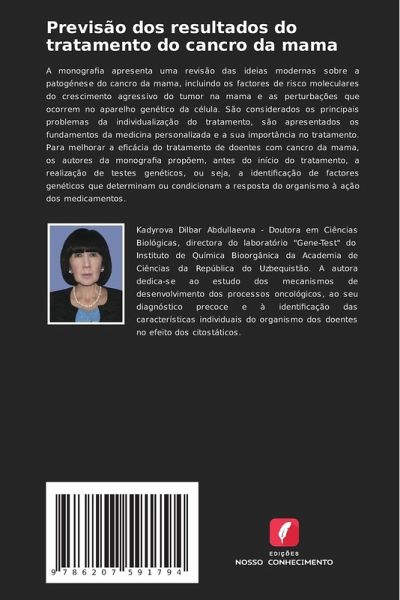 A monografia apresenta uma revisão das ideias modernas sobre a patogénese do cancro da mama, incluindo os factores de risco moleculares do crescimento agressivo do tumor na mama e as perturbações que ocorrem no aparelho genético da célula. São considerados os principais problemas da individualização do tratamento, são apresentados os fundamentos da medicina personalizada e a sua importância no tratamento. Para melhorar a eficácia do tratamento de doentes com cancro da mama, os autores da monografia propõem, antes do início do tratamento, a realização de testes genéticos, ou seja, a identificação de factores genéticos que determinam ou condicionam a resposta do organismo à ação dos medicamentos.