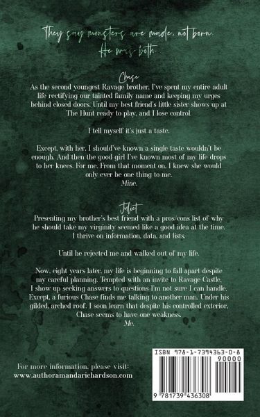 They say monsters are made, not born. He was both... Chase As the second youngest Ravage brother, I've spent my entire adult life rectifying our tainted family name and keeping my urges behind closed doors. Until my best friend's little sister shows up at The Hunt ready to play, and I lose control. I tell myself it's just a taste. Except, with her, I should've known a single taste wouldn't be enough. And then the good girl I've known most of my life drops to her knees. For me. From that moment on, I knew she would only ever be one thing. Mine. Juliet Presenting my brother's best friend with a…mehr