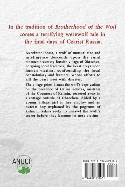 In the tradition of Brotherhood of the Wolf, comes a terrifying werewolf tale in the final days of Czarist Russia. As winter looms, a wolf of unusual size and intelligence descends upon the rural nineteenth-century Russian village of Obrechen. Forgoing local livestock, the beast preys upon human victims, confounding the local constabulary and hunters, whose efforts to kill the beast meet with disaster. The village priest blames the wolf's deprivations on the presence of Galina Sekova, mistress of the Countess of Kalinin, secreted away in a cottage outside of Obrechen. Aided by a young village girl in her employ and an outcast boy orphaned by the pogroms of Kalinin, Galina seeks to unravel the wolf's secret before they become its next victims. This is the first of an incredible forthcoming duology.