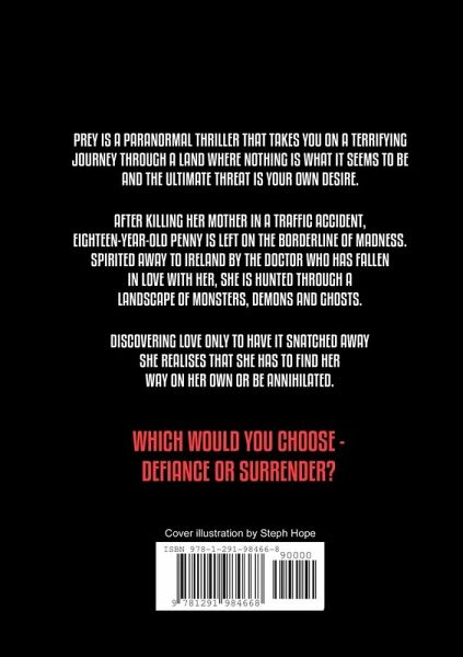 Prey is a paranormal thriller that takes you on a terrifying journey through a land where nothing is what it seems to be and the ultimate threat is your own desire. After killing her mother in a traffic accident eighteen-year-old Penny is left on the borderline of madness. Spirited away to Ireland by the doctor who has fallen in love with her, she is hunted through a landscape of monsters, demons and ghosts. Discovering love only to have it snatched away she realises she has to find her way on her own or be annihilated. Which would you choose - defiance or surrender?