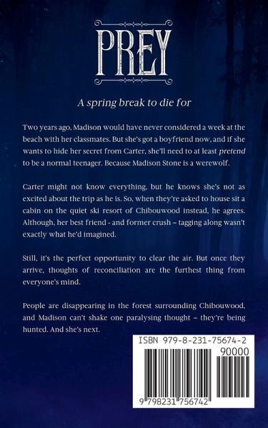 Two years ago, Madison would have never considered a week at the beach with her classmates. But she's got a boyfriend now, and if she wants to hide her secret from Carter, she'll need to at least pretend to be a normal teenager. Because Madison Stone is a werewolf. Carter might not know everything, but he knows she's not as excited about the trip as he is. So, when they're asked to house sit a cabin on the quiet ski resort of Chibouwood instead, he agrees. Although, her best friend - and former crush - tagging along wasn't exactly what he'd imagined. Still, it's the perfect opportunity to clear the air. But once they arrive, thoughts of reconciliation are the furthest thing from everyone's mind. People are disappearing in the forest surrounding Chibouwood, and Madison can't shake one paralysing thought - they're being hunted. And she's next.