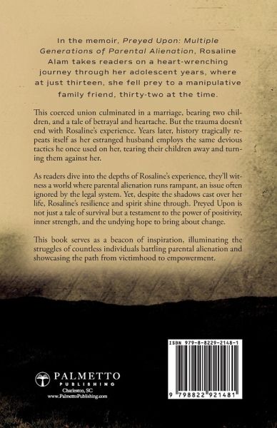 Shattered Bonds: A Harrowing Journey from Manipulation to Redemption. From the heart of Syria to the bustling streets of California, Preyed Upon: Multiple Generations of Parental Alienation unveils a gripping tale of manipulation, betrayal, and unyielding resilience. As Rosaline Alam bravely recounts her adolescent years, readers are transported to a time when, at a tender age of thirteen, she becomes ensnared in a twisted relationship with a family friend almost thrice her age. The tale doesn't just stop at her personal anguish; it spirals into a chilling déjà vu as she watches her own children fall victim to the same snares that once trapped her. Diving into this poignant memoir, one will encounter a reality where the bonds of family are preyed upon and shattered. Parental alienation, an agonizing emotional turmoil that, shockingly, one in four children of divorce experience according to the American Psychological Association, takes center stage. Yet, the American legal system turns a blind eye, leaving countless families in its wake. But Preyed Upon is more than a survivor's narrative. It's a powerful journey of rebirth and transformation, showcasing Rosaline's indomitable spirit and relentless drive to rise above her tormented past. With each page, readers will be inspired by her message: even in the darkest corners of life, one can find a beacon of hope, choose positivity, and emerge stronger. Perfect for readers of memoirs, self-help enthusiasts, and those who champion women's empowerment, this book promises not only to touch hearts but also to spark a movement for change. Whether you've faced similar battles or seek to understand the depths of parental alienation and its aftermath, Preyed Upon stands as a testament to human resilience and the enduring power of love over adversity. Dive in and bear witness to a life that chose light amidst overwhelming darkness.