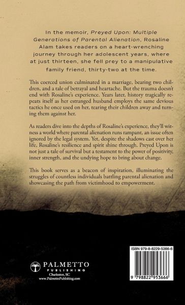 Shattered Bonds: A Harrowing Journey from Manipulation to Redemption. From the heart of Syria to the bustling streets of California, Preyed Upon: Multiple Generations of Parental Alienation unveils a gripping tale of manipulation, betrayal, and unyielding resilience. As Rosaline Alam bravely recounts her adolescent years, readers are transported to a time when, at a tender age of thirteen, she becomes ensnared in a twisted relationship with a family friend almost thrice her age. The tale doesn't just stop at her personal anguish; it spirals into a chilling déjà vu as she watches her own children fall victim to the same snares that once trapped her. Diving into this poignant memoir, one will encounter a reality where the bonds of family are preyed upon and shattered. Parental alienation, an agonizing emotional turmoil that, shockingly, one in four children of divorce experience according to the American Psychological Association, takes center stage. Yet, the American legal system turns a blind eye, leaving countless families in its wake. But Preyed Upon is more than a survivor's narrative. It's a powerful journey of rebirth and transformation, showcasing Rosaline's indomitable spirit and relentless drive to rise above her tormented past. With each page, readers will be inspired by her message: even in the darkest corners of life, one can find a beacon of hope, choose positivity, and emerge stronger. Perfect for readers of memoirs, self-help enthusiasts, and those who champion women's empowerment, this book promises not only to touch hearts but also to spark a movement for change. Whether you've faced similar battles or seek to understand the depths of parental alienation and its aftermath, Preyed Upon stands as a testament to human resilience and the enduring power of love over adversity. Dive in and bear witness to a life that chose light amidst overwhelming darkness.
