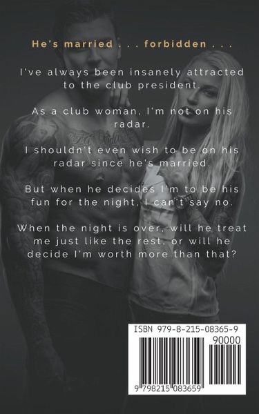 He's married . . . forbidden . . . I've always been insanely attracted to the club president. As a club woman, I'm not on his radar. I shouldn't even wish to be on his radar since he's married. But when he decides I'm to be his fun for the night, I can't say no. When the night is over, will he treat me just like the rest, or will he decide I'm worth more than that? **Please read the trigger warnings before reading this book.