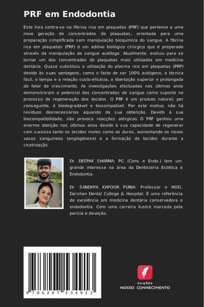 Este livro centra-se na fibrina rica em plaquetas (PRF) que pertence a uma nova geração de concentrados de plaquetas, orientada para uma preparação simplificada sem manipulação bioquímica do sangue. A fibrina rica em plaquetas (PRF) é um aditivo biológico cirúrgico que é preparado através da manipulação de sangue autólogo. Atualmente, evoluiu para se tornar um dos concentrados de plaquetas mais utilizados em medicina dentária. Quase substituiu a utilização do plasma rico em plaquetas (PRP) devido às suas vantagens, como o facto de ser 100% autógeno, a técnica fácil, o tempo e a relação custo-eficácia, a libertação superior e prolongada do fator de crescimento. As investigações efectuadas nos últimos anos demonstraram o potencial dos concentrados de sangue como suporte no processo de regeneração dos tecidos. O PRF é um produto natural; por conseguinte, é biodegradável e biocompatível. Por este motivo, não há resíduos desnecessários aquando da sua obtenção. Devido à sua biocompatibilidade, não provoca reacções alérgicas. O PRF ganhou uma enorme atenção nos últimos anos devido à sua capacidade de regenerar com sucesso tanto os tecidos moles como os duros, aumentando os novos vasos sanguíneos (angiogénese) e a formação de tecidos durante a cicatrização.