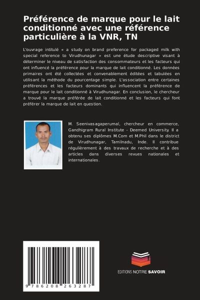 L'ouvrage intitulé ' a study on brand preference for packaged milk with special reference to Virudhunagar ' est une étude descriptive visant à déterminer le niveau de satisfaction des consommateurs et les facteurs qui ont influencé la préférence pour la marque de lait conditionné. Les données primaires ont été collectées et convenablement éditées et tabulées en utilisant la méthode du pourcentage simple. L'association entre certaines préférences et les facteurs dominants qui influencent la préférence de marque pour le lait conditionné à Virudhunagar. En conclusion, le chercheur a trouvé la marque préférée de lait conditionné et les facteurs qui font préférer la marque de lait en question.