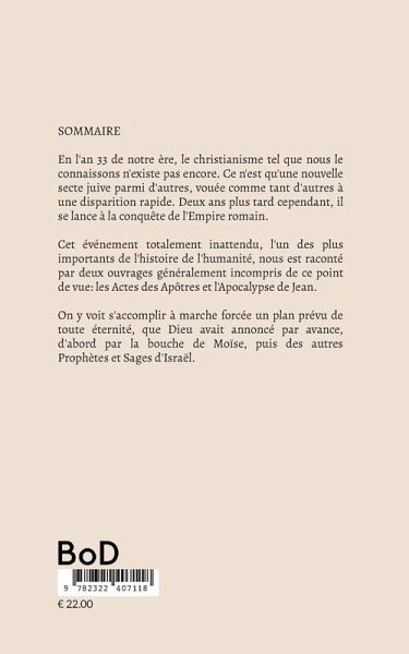 SOMMAIREEn l'an 33 de notre ère, le christianisme tel que nous le connaissons n'existe pas encore. Ce n'est qu'une nouvelle secte juive parmi d'autres, vouée comme tant d'autres à une disparition rapide. Deux ans plus tard cependant, il commence la conquête de l'Empire romain.Cet événement totalement inattendu, l'un des plus importants de l'histoire de l'humanité, nous est raconté par deux ouvrages généralement incompris de ce point de vue: les Actes des Apôtres et l'Apocalypse de Jean. On y voit s'accomplir à marche forcée un plan prévu de toute éternité, que Dieu avait annoncé par avance, d'abord par la bouche de Moïse, puis des autres Prophètes et Sages d'Israël.