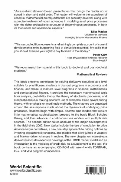 This book presents techniques for valuing derivative securities at a level suitable for practitioners, students in doctoral programs in economics and finance, and those in masters-level programs in financial mathematics and computational finance. It provides the necessary mathematical tools from analysis, probability theory, the theory of stochastic processes, and stochastic calculus, making extensive use of examples. It also covers pricing theory, with emphasis on martingale methods. The chapters are organized around the assumptions made about the dynamics of underlying price processes. Readers begin with simple, discrete-time models that require little mathematical sophistication, proceed to the basic Black-Scholes theory, and then advance to continuous-time models with multiple risk sources. The second edition takes account of the major developments in the field since 2000. New topics include the use of simulation to price American-style derivatives, a new one-step approach to pricing options by inverting characteristic functions, and models that allow jumps in volatility and Markov-driven changes in regime. The new chapter on interest-rate derivatives includes extensive coverage of the LIBOR market model and an introduction to the modeling of credit risk. As a supplement to the text, the book contains an accompanying CD-ROM with user-friendly FORTRAN, C++, and VBA program components.