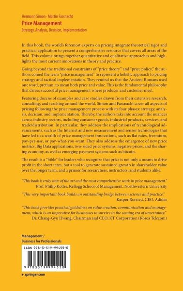 Featuring dozens of examples and case studies drawn from their extensive research, consulting, and teaching around the world, Simon and Fassnacht cover all aspects of pricing following the price management process with its four phases: strategy, analysis, decision, and implementation. Thereby, the authors take into account the nuances across industry sectors, including consumer goods, industrial products, services, and trade/distribution. In particular, they address the implications of technological advancements, such as the Internet and new measurement and sensor technologies that have led to a wealth of price management innovations, such as flat rates, freemium, pay-per-use, or pay-what-you-want. They also address the emergence of new price metrics, Big Data applications, two-sided price systems, negative prices, and the sharing economy, as well as emerging payment systems such as bitcoin.